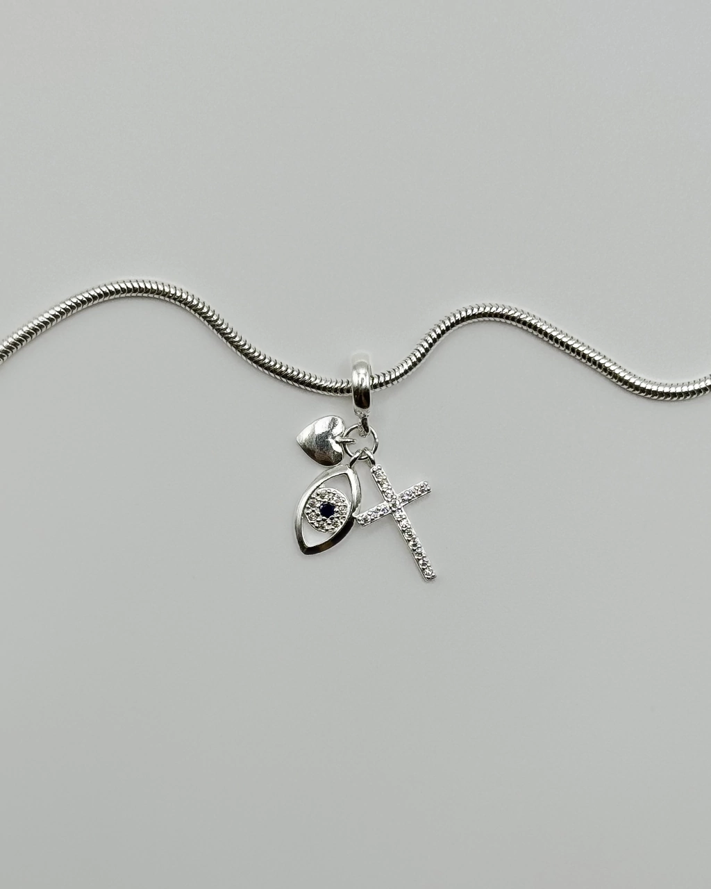 Berloque patuá mini coração, cruz cravejada e olho grego