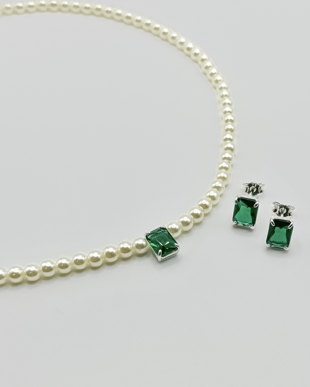 Conjunto colar e brinco pérolas e ponto de luz quadrado zircônia azul